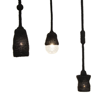Woven black leather and black cotton covered electrical cord with glass LED bulb. Standard 3 prong wall plug. Light - 13 x 13 x 70 cm. Cord length - 200 cm.