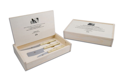 Set of three cheese knives for soft and semi-hard cheeses - stainless steel full tang blades with white plexiglass handles. Handcrafted in Italy by Coltellerie Berti's skilled artisans using the same manufacturing techniques and materials used in 1895.