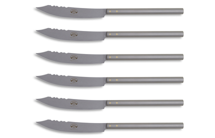 Serrated stainless steel laser cut blade and handle perfect for pizza or bread - six piece set. Also available as smooth blade knives for meat and forks.