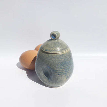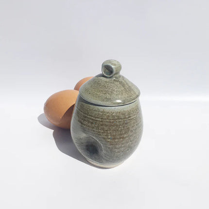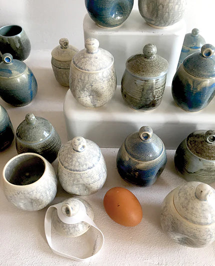 Ägg Love Léa coddlers come in three tones, pearl/white, a grey/green and blue/green. They all have a natural, earthy feel. The finishes are sometimes more shiny, sometimes more matt. It depends on the clay and the day. They're perfect as egg coddlers and as tableware containers for condiments.