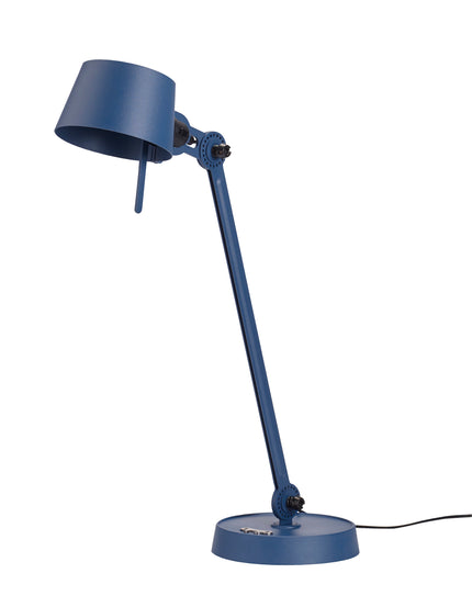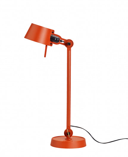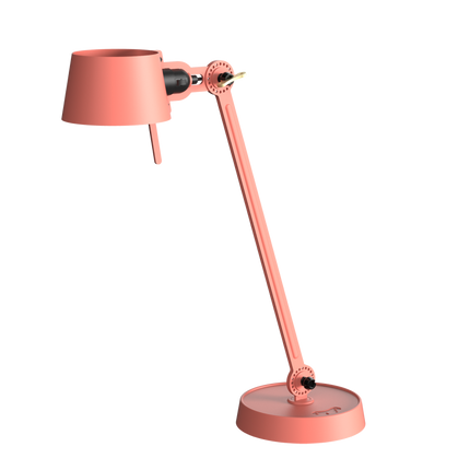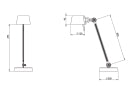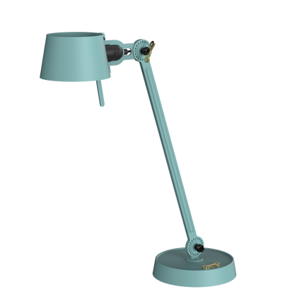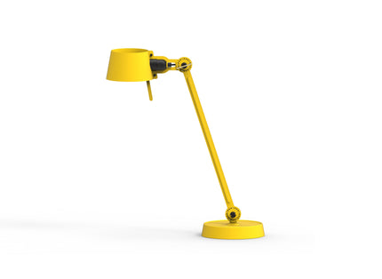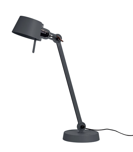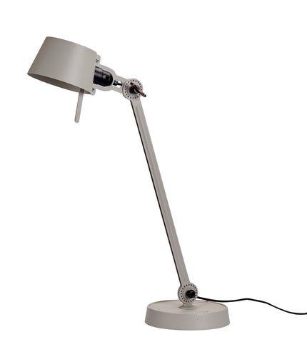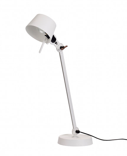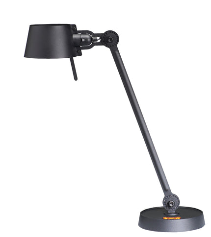 Single arm desk lamp with foot in coated steel and shade in coated aluminium. The lamp head and arm are adjustable with special wingnuts.