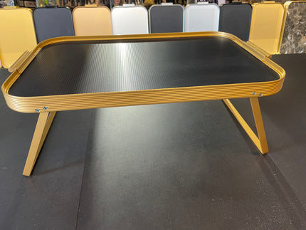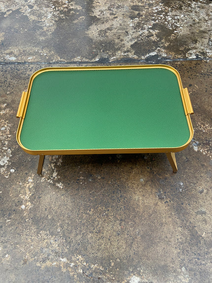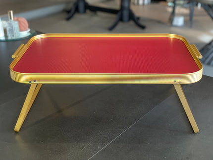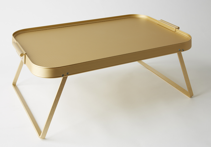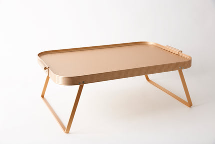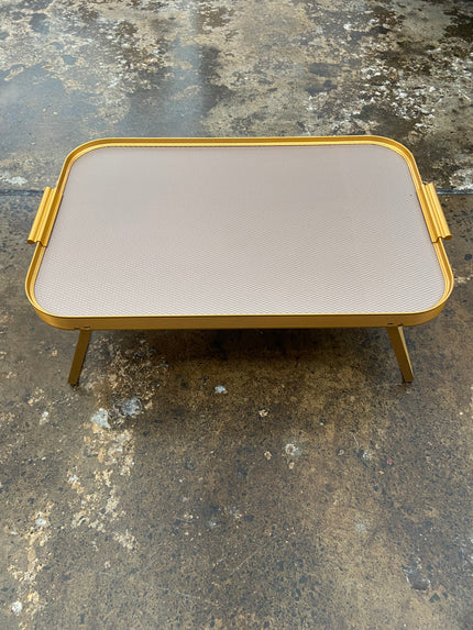 The Kaymet Lap/ Bed Tray has been produced in London since the 1950s. The anodised aluminium tray with embossed diamond pattern and ribbed extruded edge and handle sections are all hand finished and assembled. Folding sledge legs allow for use as both lap tray and standard tray.