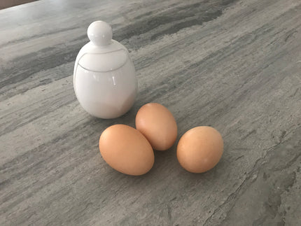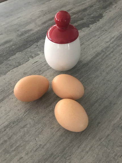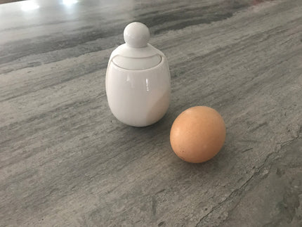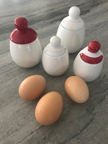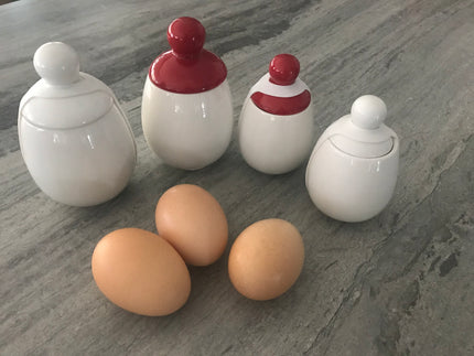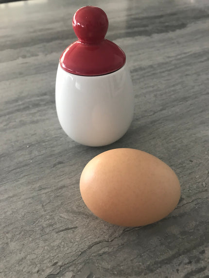 White gloss porcelain cup and lid with white silicon rubber band designed by Swedish Jois James. Malin is for a single egg and Henrik can hold up to three eggs.