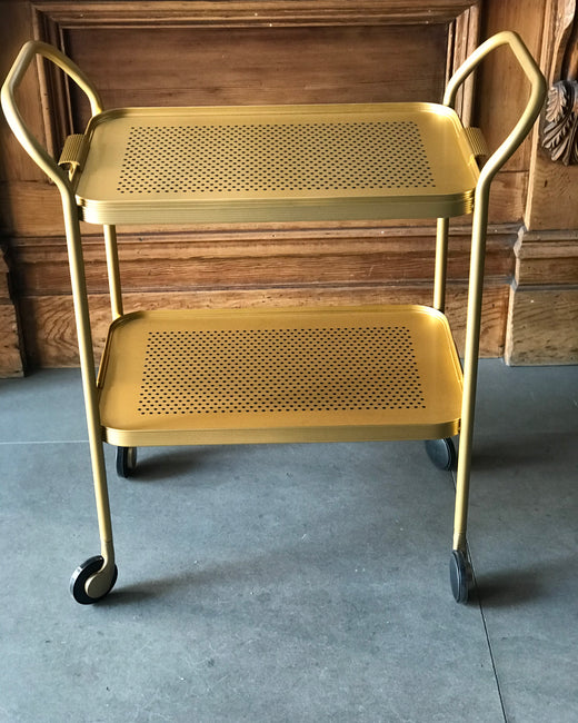 Made by Kaymet, London since the 1950s. Anodised 2 tier removable top tray with aluminium trolley with embossed diamond pattern on tray surfaces and ribbed extruded tier edges.