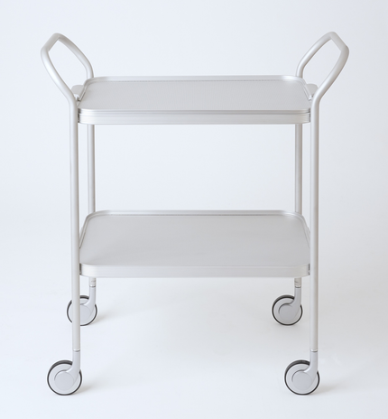 Made by Kaymet, London since the 1950s. Anodised 2 tier removable top tray with aluminium trolley with embossed diamond pattern on tray surfaces and ribbed extruded tier edges.