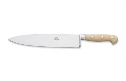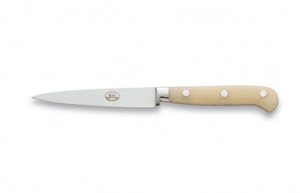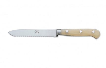 Mondopiero supplies handmade Coltellerie Berti single forged kitchen knives with smooth blades and serrated blades and with white plexiglass handles.