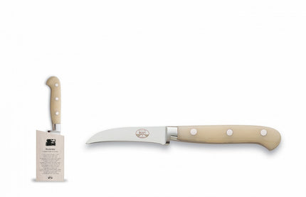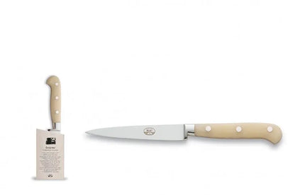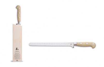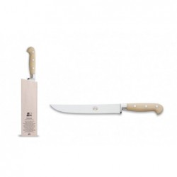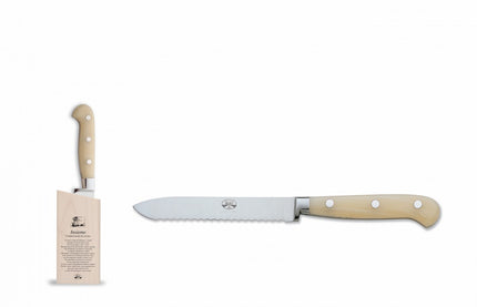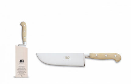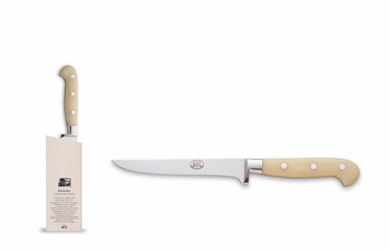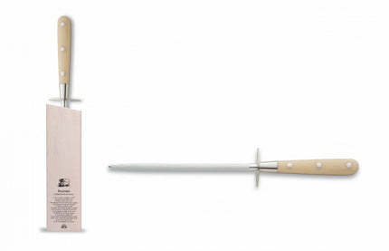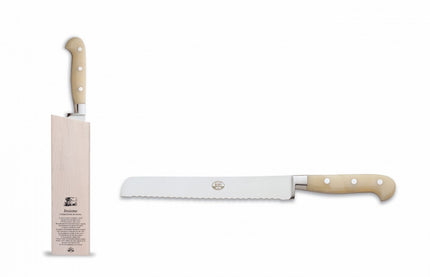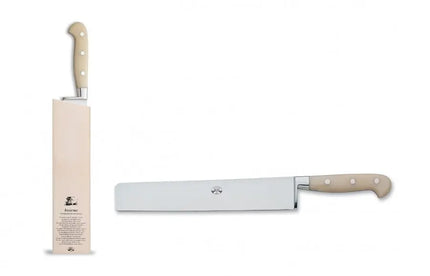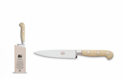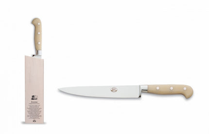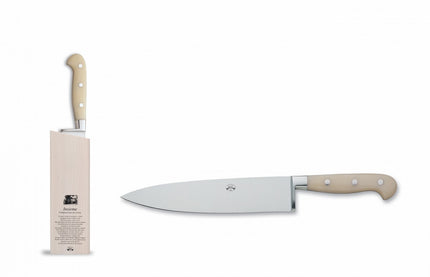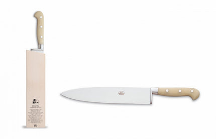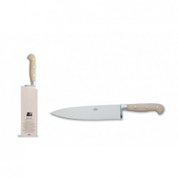 Kitchen knives with forged blades, full tang and rivetted white plexiglass handles with "Coltellerie Berti" patented individual labelled magnetic block storage system.