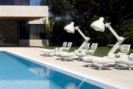 Lummel is the Giant floor lamp - 225 tall made from recyclable PE (plastic) rotational molded product. The unique design is inspired by the traditional desk lamp, is a few sizes bigger and made in vibrant colours. It's adjustable in height and direction and is suitable for indoors and outdoors.