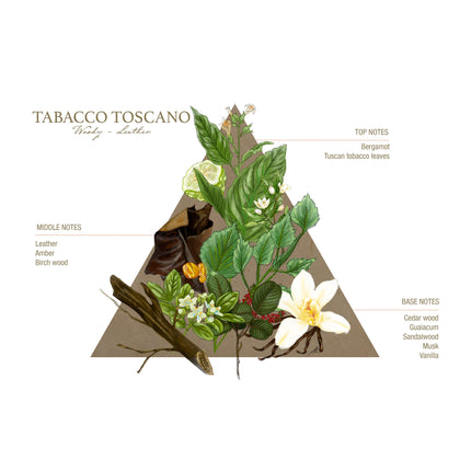 Inspired by the famous tuscan tobacco leaves a bouquet of woody oriental notes blended with smoky vanilla base notes.