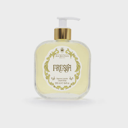 Fresia: the enveloping freshness aroma of Officina Profumo-Farmaceutica di Santa Maria Novella. The liquid soap is formulated with surfactants of vegetable origin and enriched with natural saponins. The formula is completed with calendula extract, chosen for its softening properties.