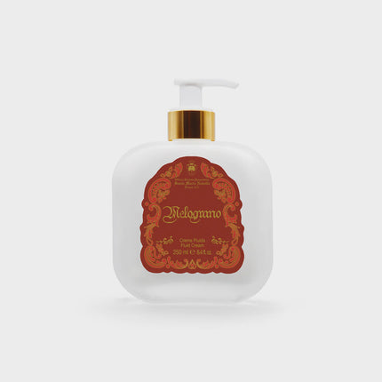 Melograno: the distinctive essence of Officina Profumo-Farmaceutica di Santa Maria Novella. Our fluid cream is composed with a formula based on vegetable oils and butters, especially conceived to make the body skin pleasantly soft and perfumed. Enriched with pomegranate flower extract with antioxidant, astringent and energising properties.
