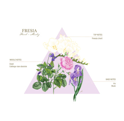 A fragrance with a fresh and clean tone. It opens with brilliant notes of fresia that characterize the bouquet. In the heart, violet and centifolia rose absolute give the mélange candid and delicate nuances. The base note, a powdery accord given by the iris note that is joint by soft musk notes.