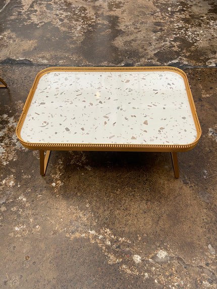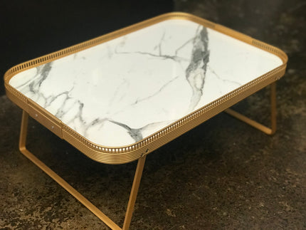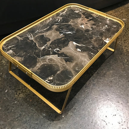 The Kaymet Lap/ Bed Tray has been produced in London since the 1950s. The Gallery anodised brushed aluminium tray with laminate onyx or marble design top with cutout edges detail is hand finished and assembled. Folding sledge legs allow for use as both lap tray and standard tray.