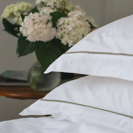 Beautiful, classic, smooth white Italian cotton, standard size pillowcases with a simple, elegant machine embroidered, coloured satin stitch border, a 7cm wide oxford flange and a slip closure. Sold in pairs.