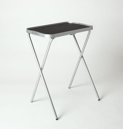 Anodised brushed aluminium light-weight folding table with ribbed extruded edge sections and rubber grips.