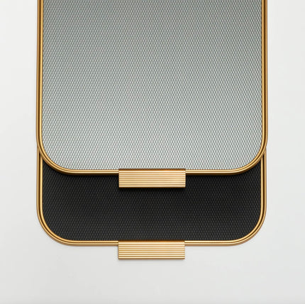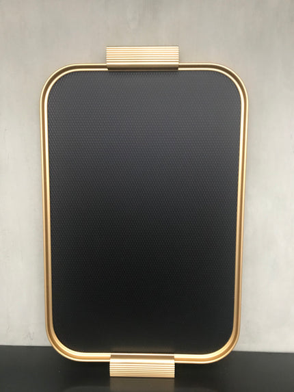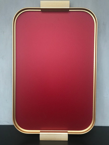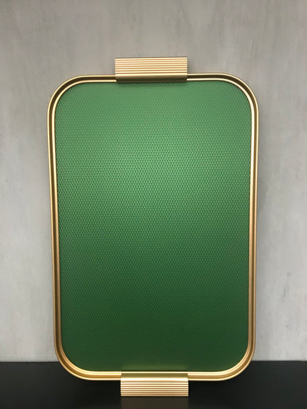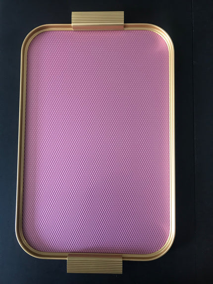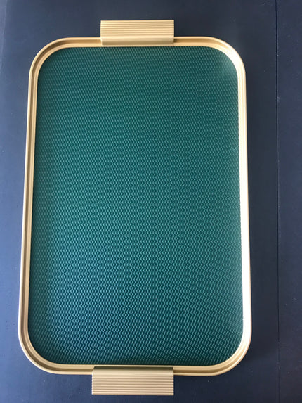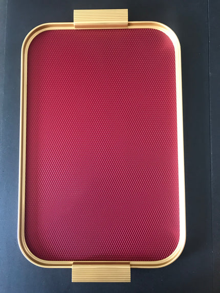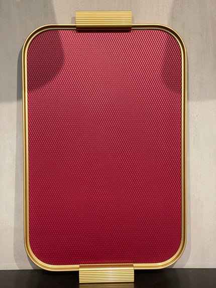 Gold anodised aluminium tray with ribbed extruded edge and handle sections, hand finished and assembled. Embossed colour diamond design.