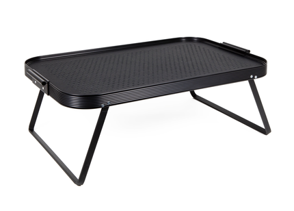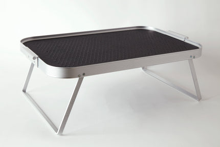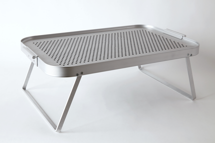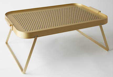 The Kaymet Lap/ Bed Tray has been produced in London since the 1950s. Anodised brushed aluminium tray with rubber grips and ribbed extruded edge and handle sections, hand finished and assembled. Folding sledge legs allow for use as both lap tray and standard tray.