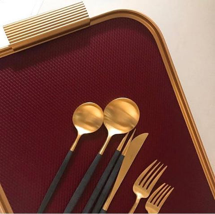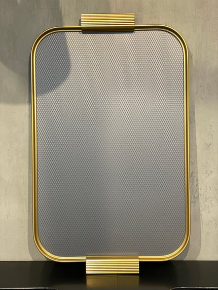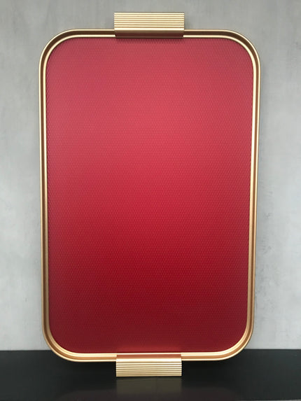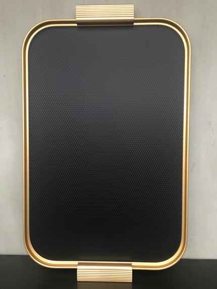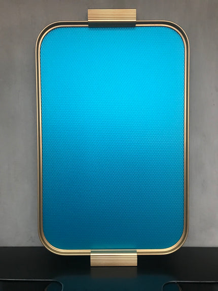 Gold anodised aluminium tray with ribbed extruded edge and handle sections, hand finished and assembled. Embossed colour diamond design.