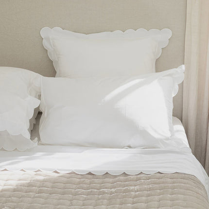 Beautiful, smooth, white Italian 400TC cotton flat sheet and standard size pillowcase sets featuring a decorative border with lovely white satin stitch machine embroidered, scalloped edging.