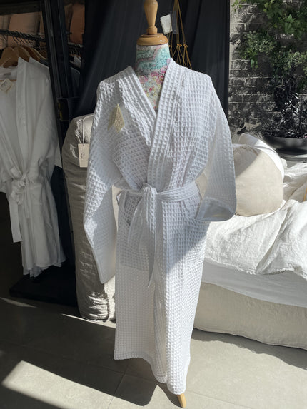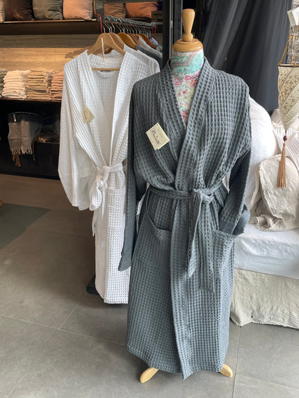 Luxurious absorbent pure cotton waffle kimono style bathrobes made in Italy. Plain solid colours with linen bordered cuffs.