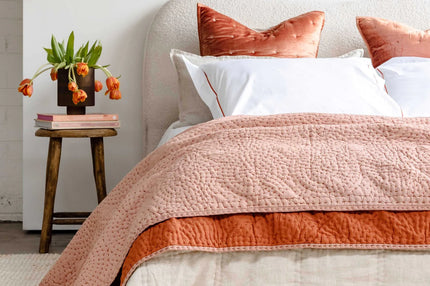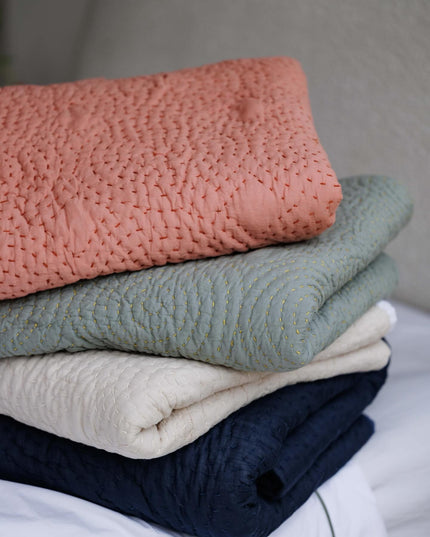 A lovely, handcrafted, lightweight, reversible, comforter in 100% cotton with a contrasting coloured backing. Features traditional, hand done, kantha style topstitching in a beautiful circle design that creates a delicate pattern of individual stitches.
