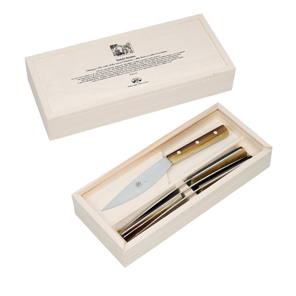Box set of four steak knives with laser cut stainless steel full tang blades and cornotech handles with three rivets. Handcrafted in Italy by Coltellerie Berti's skilled artisans using the same manufacturing techniques and materials used in 1895.