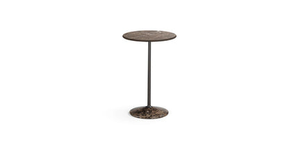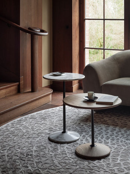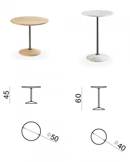 The several combinations of the three geometries and the three materials are enriched by some dimensional variations and, with the study and fine-tuning of their overall proportions, take their definitive and complete form where the elegant brass column, which draws and solves the connection and attachment between the top and the base, becomes the distinctive element of the project without taking over the other elements that take part in the compositional game.