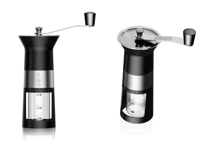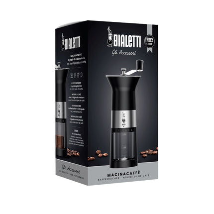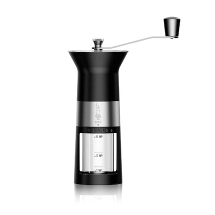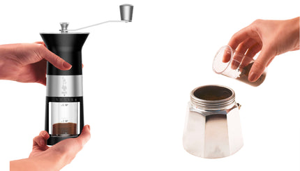 A practical measure to grind the right quantity of coffee for the 1, 3 or 6 cup moka pot. A ceramic grinding system that adjusts how finely the coffee is ground.