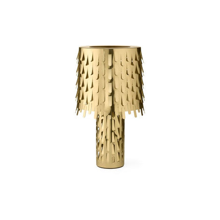 The lamp is made of polished brass, synonymous of elegance and preciousness. It is composed of two overlapping cylinders, the large stem supports an important lampshade decorated with a thousand leaves bent by the wind. The perforated structure and the opening of the lampshade create suggestive radiations of light, like light passing through the dense foliage of a tropical forest.