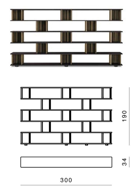 Versatile, Plomis masterfully explores the friction and harmony between minimalist elegance and ornate design. The fragmented surfaces create a stunning interplay of light and shadow, enhancing the contrast between solid metal and the wooden shelfs.