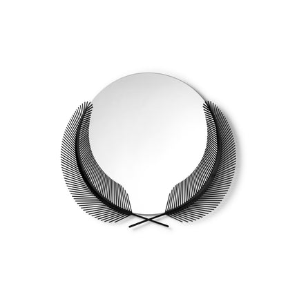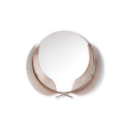 The round mirror surface is sunk into the graphic embrace of two palm fronds. The Sunset mirror is a wall-mounted declaration of the true summer paradise scenario that lingers just below the surface of the present moment.