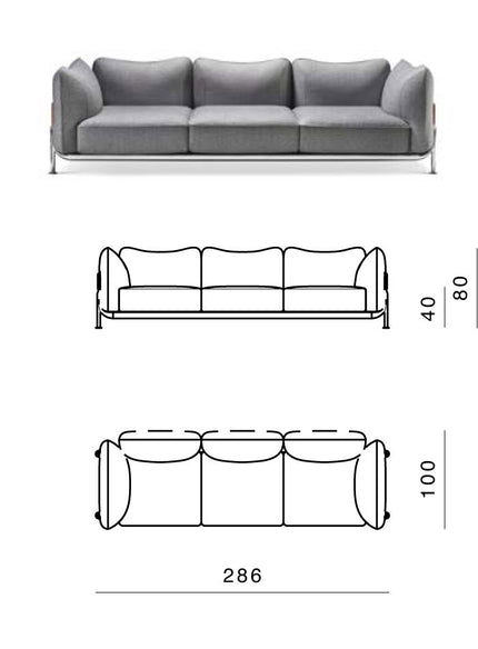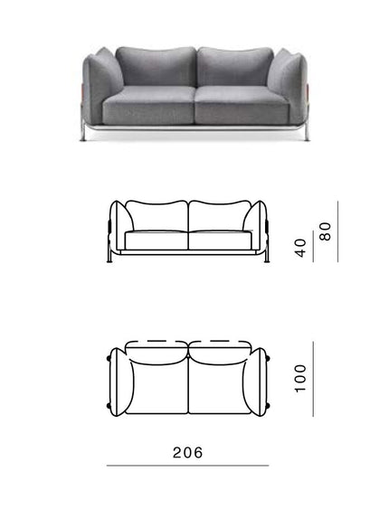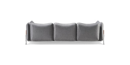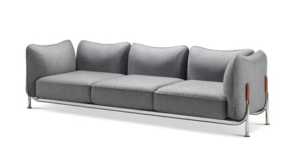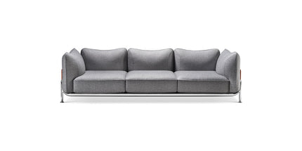 The name Tasca (pocket) refers to the cushion’s elegant leather pockets in which the sofa structure is housed. Both the pockets and the metal parts are reminiscent of distinct equestrian accessories.