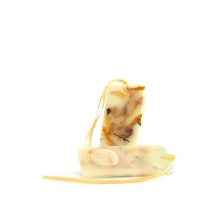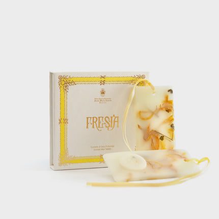 The box contains two hand-made scented wax tablets, inspired by the Fresia Cologne fragrance and its notes of violet and centifolia rose.