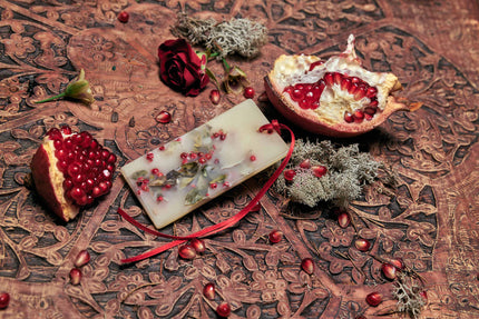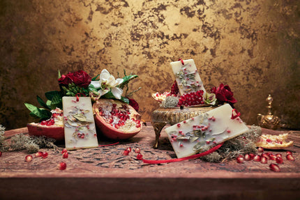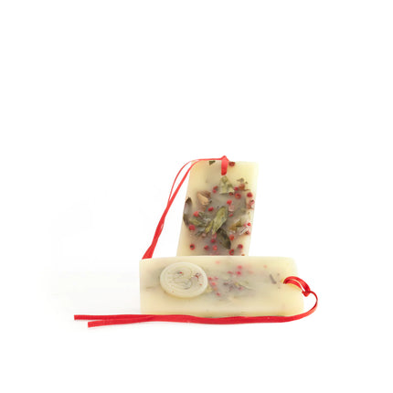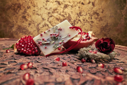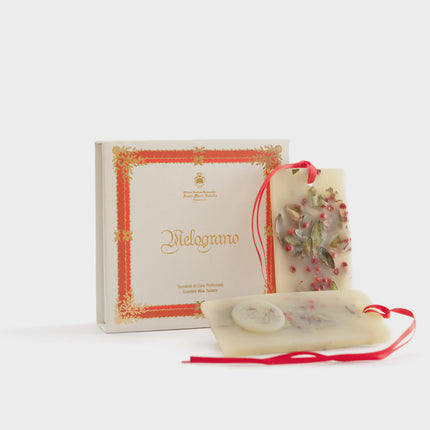 The box contains two hand-made scented wax tablets, inspired by the Melograno Cologne fragrance and its notes of bergamot, spices and labdanum.