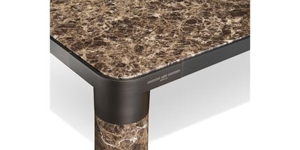 This is beautifully portrayed in the tables, where the marble tabletop matches with the legs in turned marble, or with the armchairs featuring leather seats and legs of the same color.