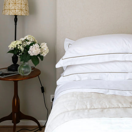 Beautiful, classic, smooth white Italian 400TC cotton, queen or king flat sheet and standard size pillowcase sets featuring an oxford flange with a simple, elegant machine embroidered, satin stitch border. Pillowcases come in pairs.