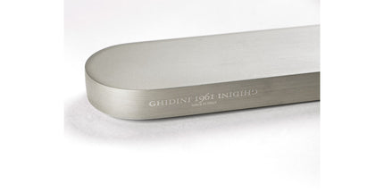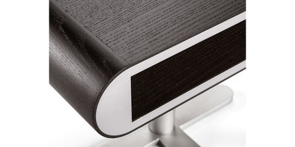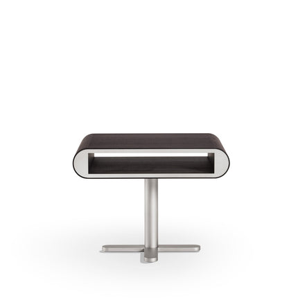 The base is formed by a central column that extends into a four-spoke, pedestal-type support, also in a satin platinum finish, the upper structure is a container open on both sides, useful for storing books, objects or small devices.
