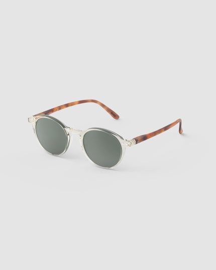 Champagne coloured round frames bio-based sunglasses with green polarised lenses.
