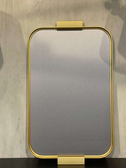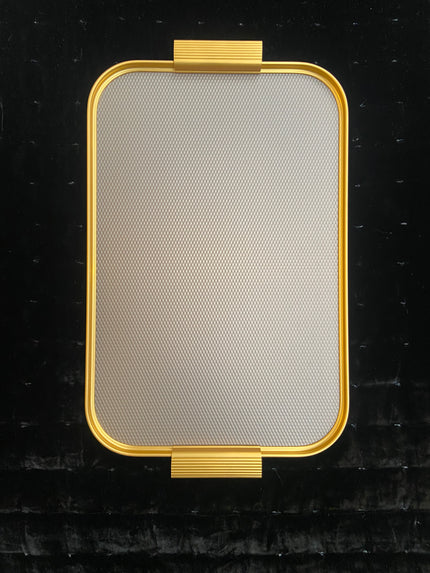 Anodised aluminium tray with ribbed extruded edge and handle sections, hand finished and assembled. Embossed colour diamond design.