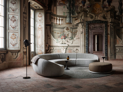 Abbracci (hug in Italian) is wrapped with soft nubuck leather crowned by a brass metal tube at the base, underlining its curved and welcoming shape, while the backrest design compliments this simple yet important gesture.