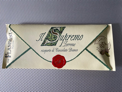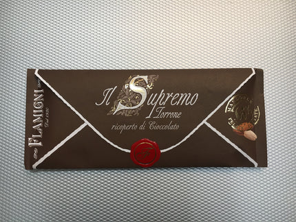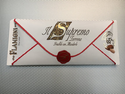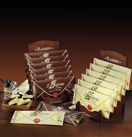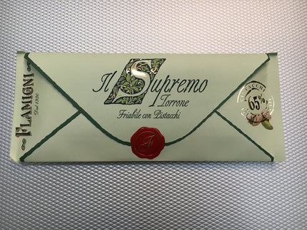 The Flamigni 'Il Supremo' range of torrone is the very finest brittle pistachio and almond Italian nougat covered with or without chocolate and presented in attractive 150 g gift envelopes.