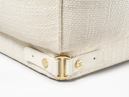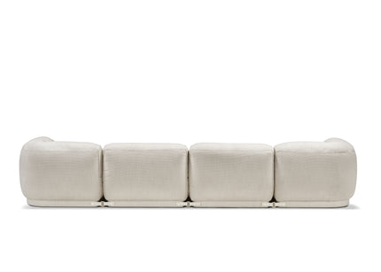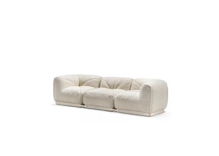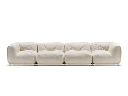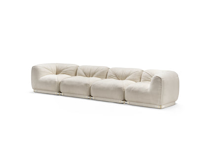 Modular sofa composed of two basic elements that are joined with a belt characterized by a brass buckle. The seat is deep and comfortable with soft and wide curves.