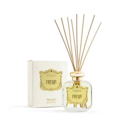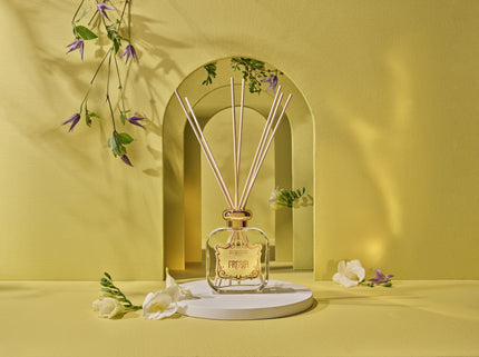The freshness of freesia flower is a lively match for every room of the house: our iconic Fresia becomes a unique and delicate ambient fragrance. Preserving all the iconic features of the Firenze 1221 editions, it comes with a golden cap, a monogrammed bottle and a finely engraved golden label. Fresia tells us the story of a south-african native flower that meets rose, violet and musk in a fresh and clean tone.