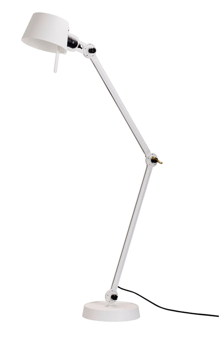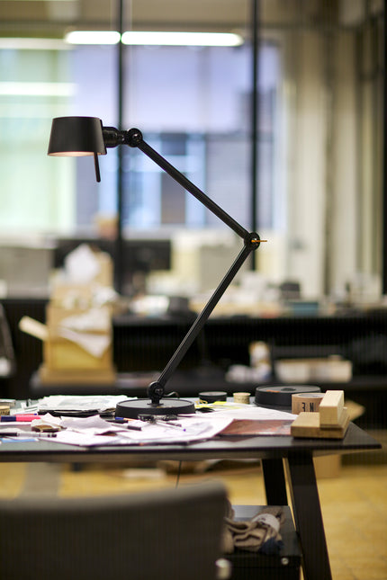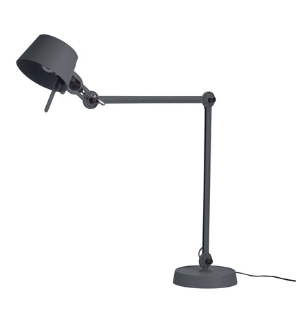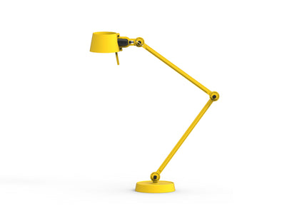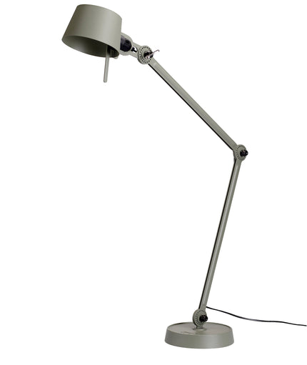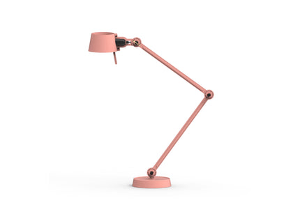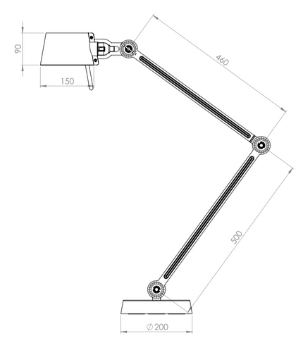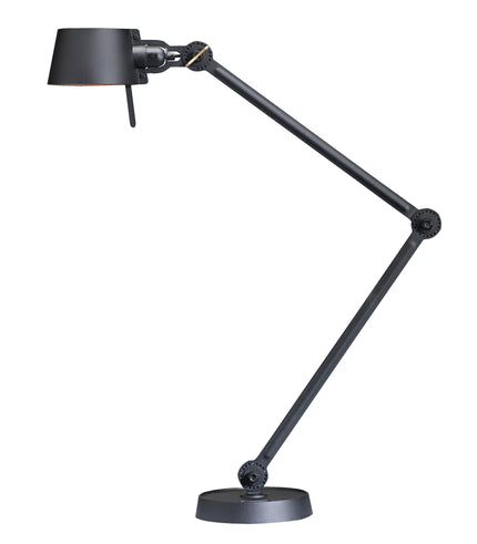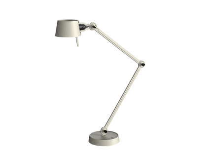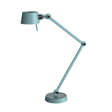Double arm desk lamp with foot in coated steel and shade in coated aluminium. The lamp head and arm are adjustable with special wingnuts.