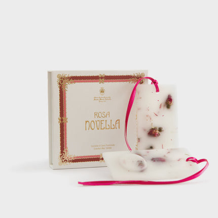 The box contains two hand-made scented wax tablets, inspired by the Rosa Novella Cologne fragrance and its notes of petitgrain, rose and sandalwood.