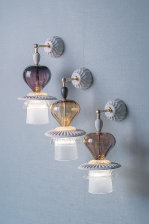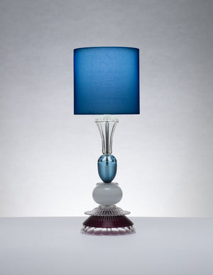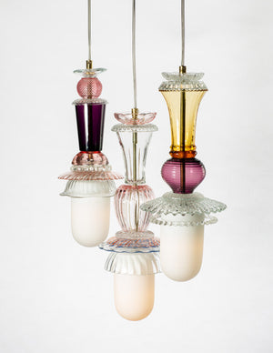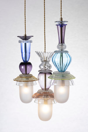 She uses vintage glassware as the material basis to create new lighting and table pieces, changing the form and function of the original objects. All the glassware is handmade and unique, composed of individually selected elements.