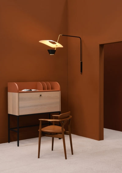 The G25 wall lamp can be used above a dining table, as it was during its designer’s lifetime, but equally in an office or entrance hall, because its proportions make space fitting particularly easy. With its metal deflector, this prestigious wall lamp offers you a quality of diffused lighting that creates an extremely comfortable ambience. Its brushed and lacquered brass rod is adjustable for length.