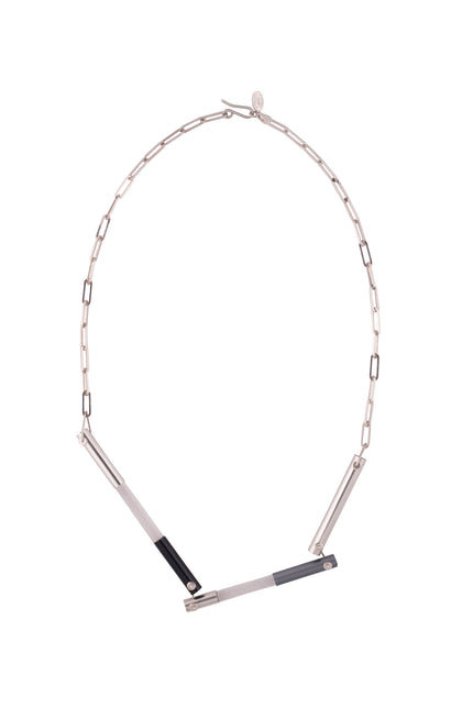 Frank Lloyd Wright is the architect who inspired this modern, clean lined necklace. This angular masterpiece has been designed and engineered to allow you to create the unique look of the necklace. Move the bars to create various angled shaped necklaces that feature a fantastic, edgy look. This necklace features hand pulled glass rods and anodised tubing with colours that can be customised to suit your taste.
