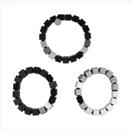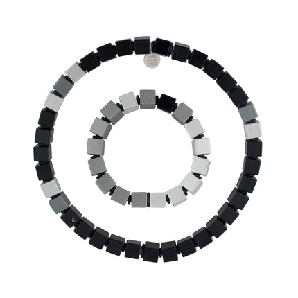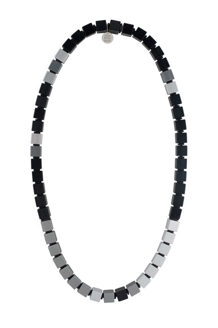 Created by Chris Bohan, this classic monochrome colour of matt black, starlight silver and smoking gunmetal is effortlessly chic and goes with just about anything in your wardrobe. Handmade in anodised aluminium beads, threaded on nitrile with black o-rings and super strong magnetic sterling silver clasp