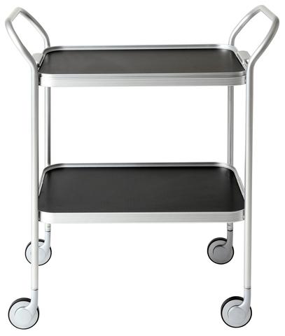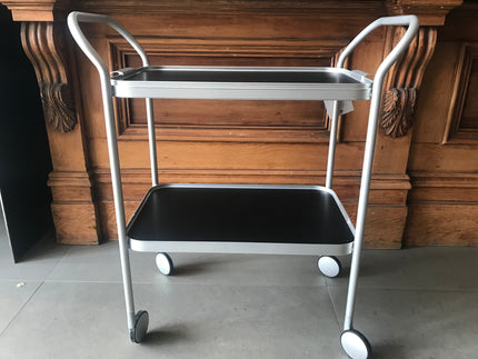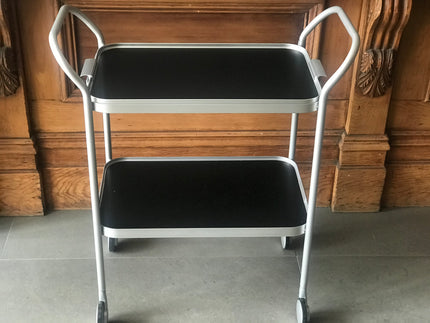 Made by Kaymet, London since the 1950s. Anodised 2 tier removable top tray with aluminium trolley with embossed diamond pattern on tray surfaces and ribbed extruded tier edges.
